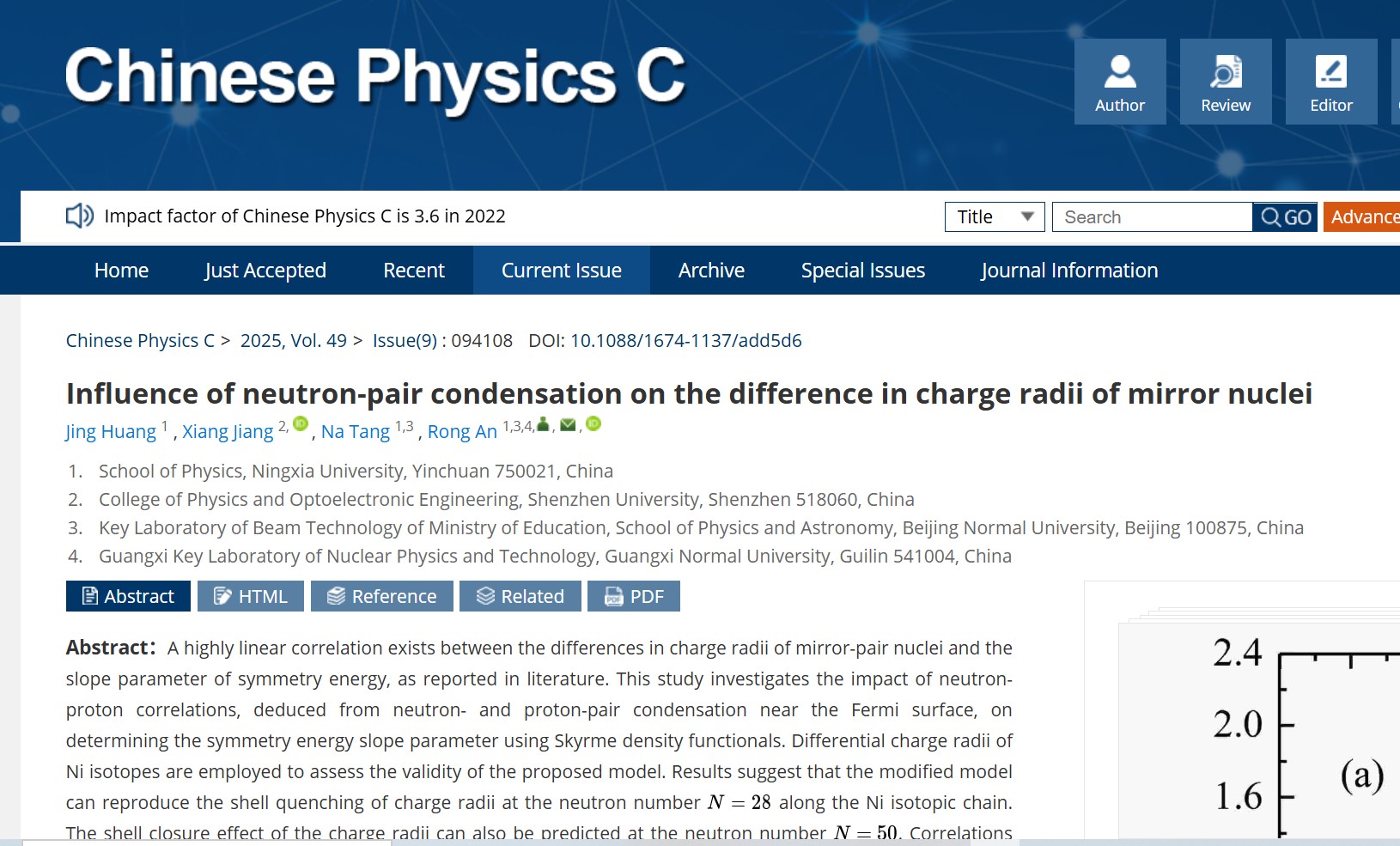 2025年9月11日,8181801威尼斯本科生黄精(学号:12021241908,现为海南大学物理与光电工程学院硕士研究生)与深圳大学蒋翔博士、8181801威尼斯唐娜博士和安荣博士,在国际核物理期刊《Chinese Physics C》上发表题为《Influence of neutron-pair condensation on the difference in charge radii of mirror nuclei》的原创性论文。文章中考虑了中子对凝聚对镜像核电荷半径差值与对称能斜率之间关联性的影响,研究发现,考虑中子对凝聚后得到了比较硬的核物质状态方程(EoS)。该论文在线发表时间为2025年5月8日,黄精为该论文的第一作者,安荣博士为该论文的唯一通讯作者,8181801威尼斯为该论文的第一通讯单位。《Chinese Physics C》为粒子物理与原子核物理专业国际英文期刊,目前影响因子3.1(2024年),中科院分区为二区,JCR分区为Q1/Q2,在核物理领域具有非常高的认可度。